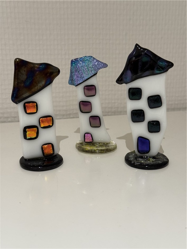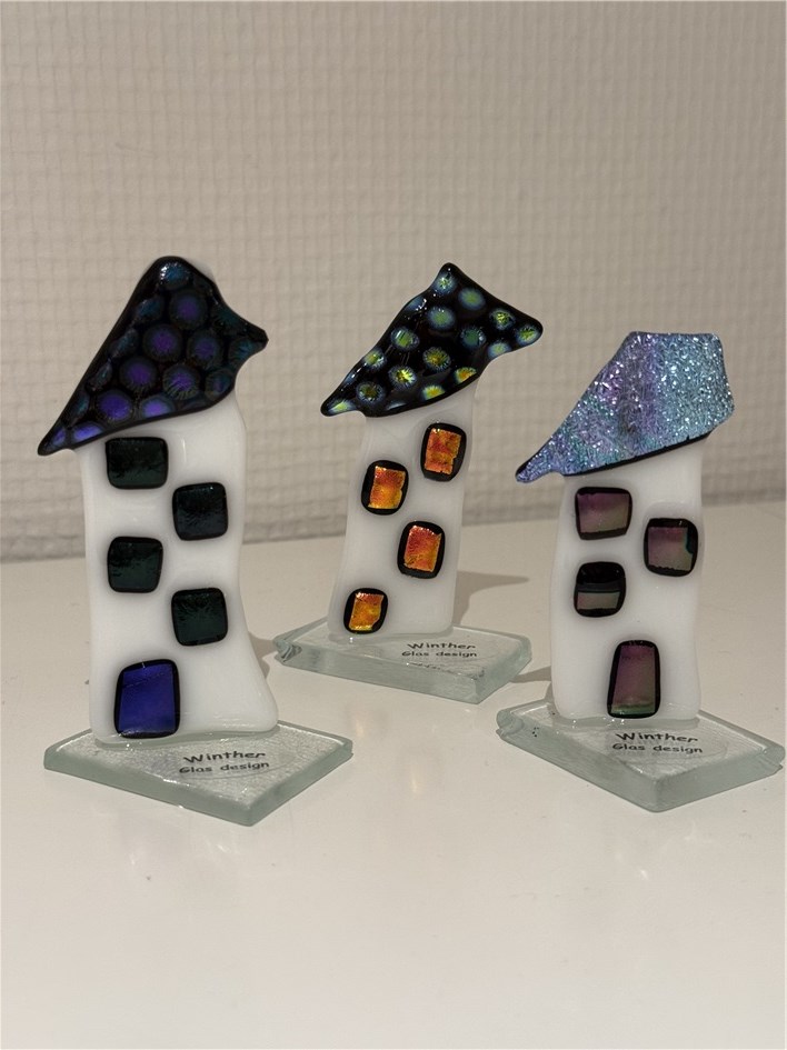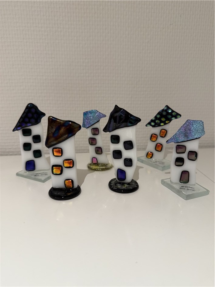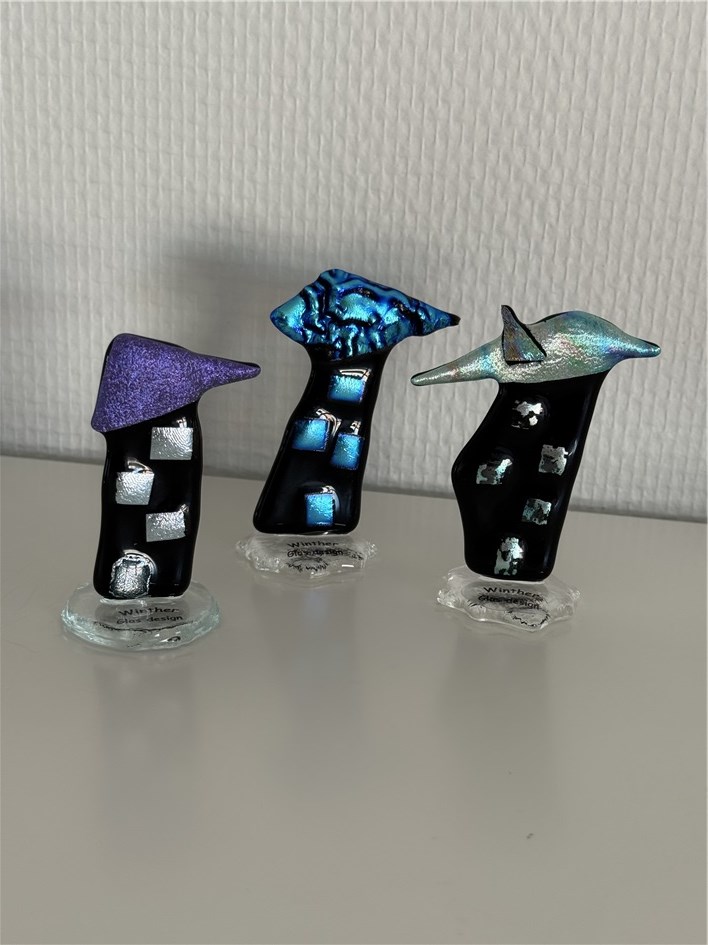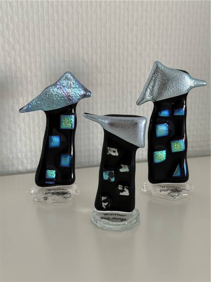 Husene er dekoreret med dichroic glas som giver en sjov effekt når lyset falder på dem.