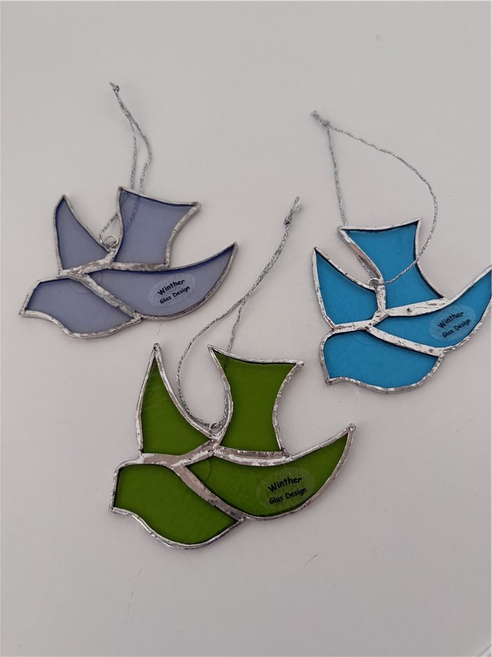 Glasfugl i Tiffany glas til ophæng. (Str: 9x10 cm)