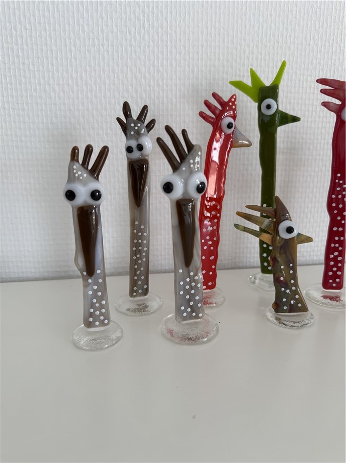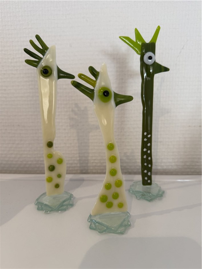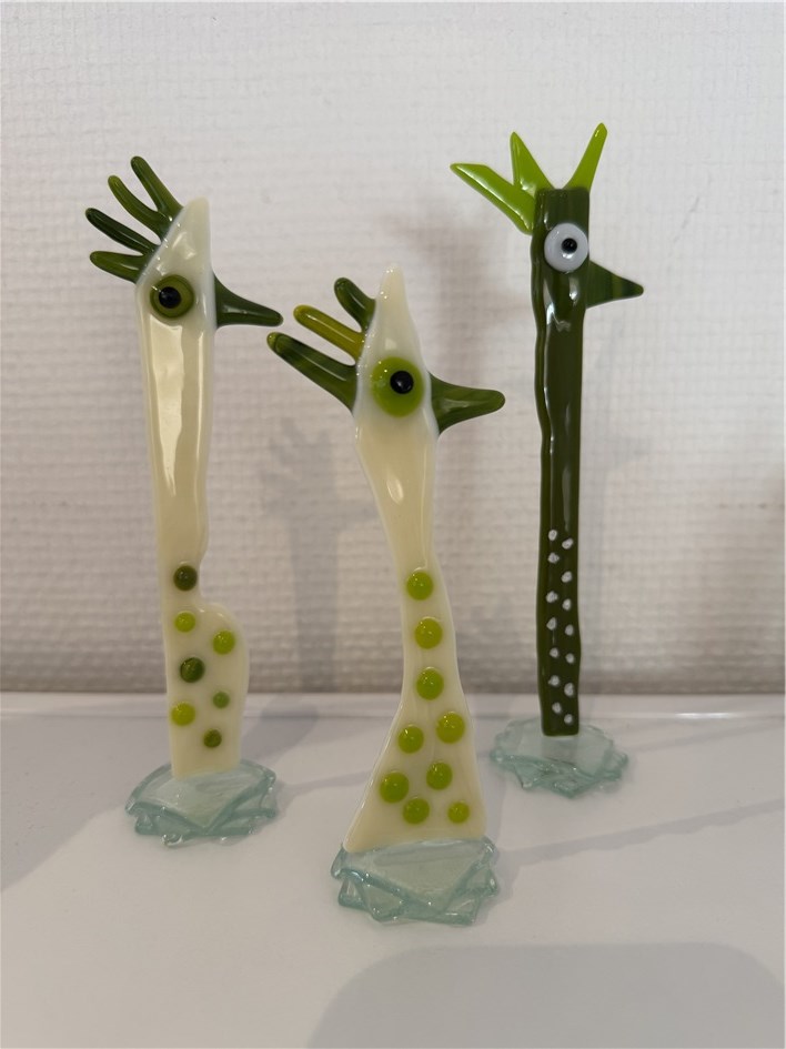 De kan bestilles på glasfod, med ophæng eller på en glaspind, så de kan stå ude i havekrukkerne. De kan tåle at stå ude hele året.