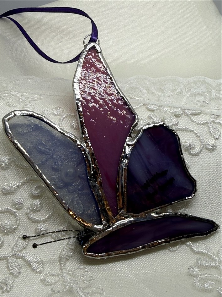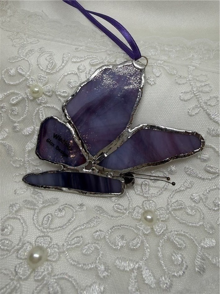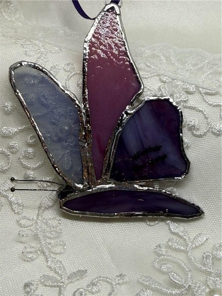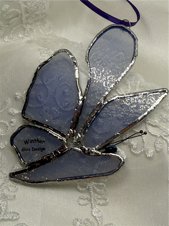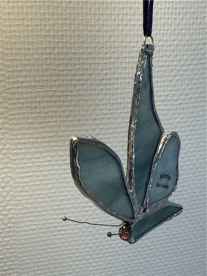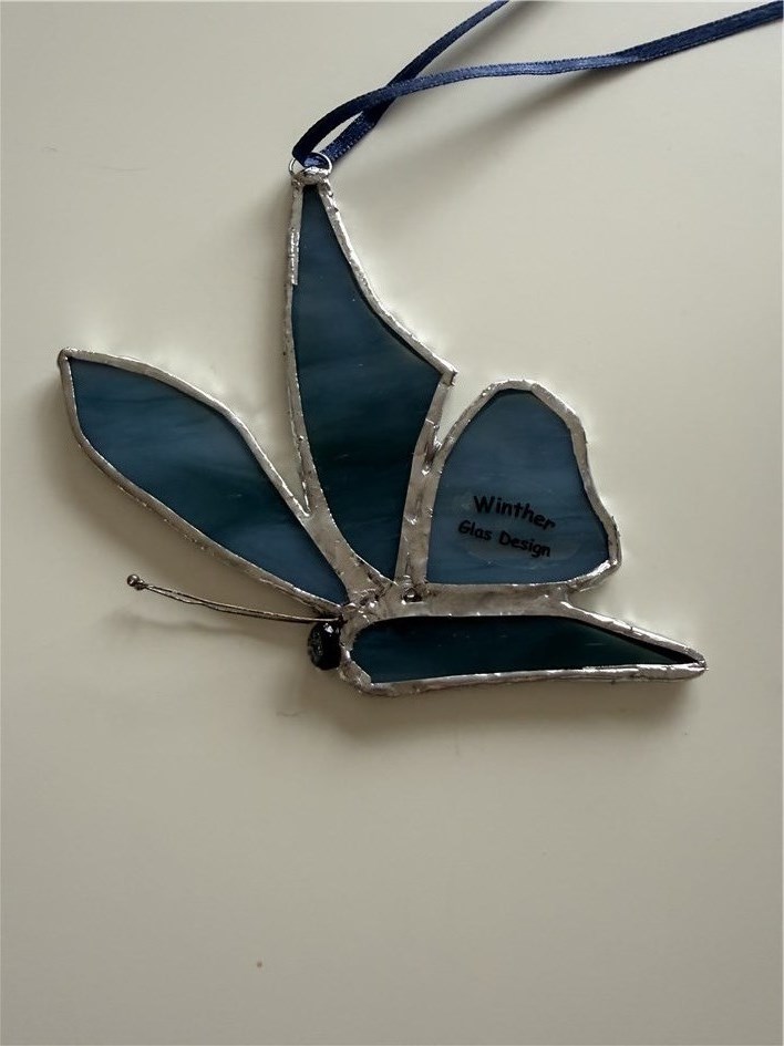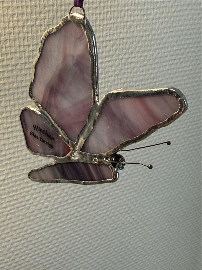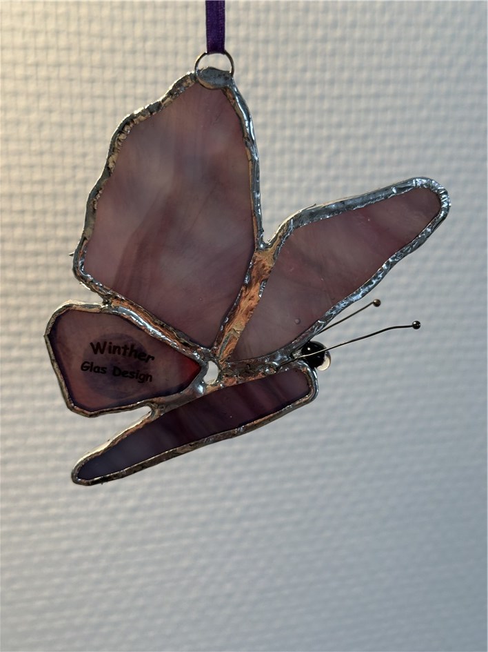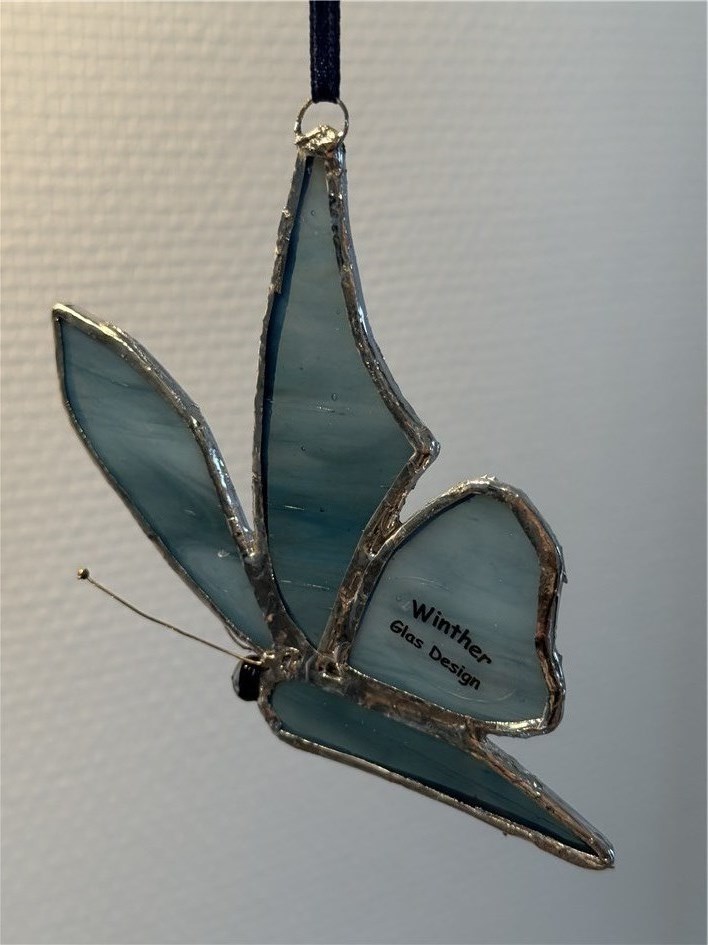 Smuk sommerfugl i Tiffany til ophæng. (str. ca 8 x 10 cm)
