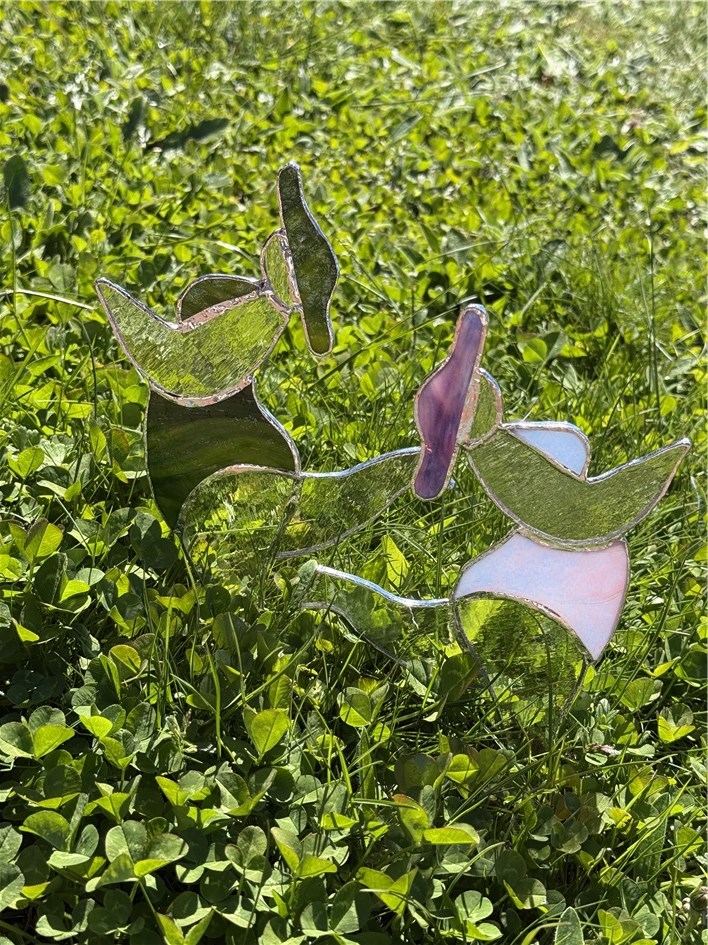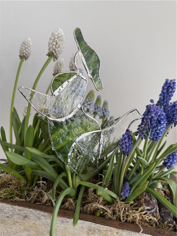 Damen sidder på en lille metal pind så den kan pynte i urtepotter eller ude i havens krukker.