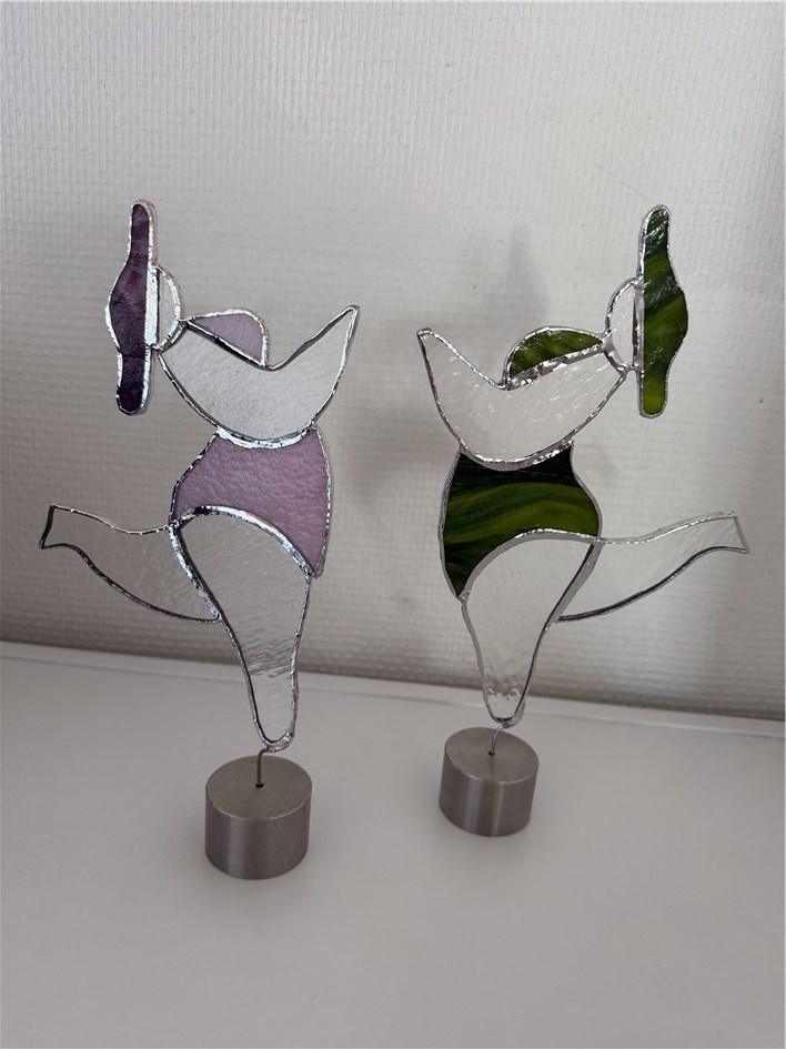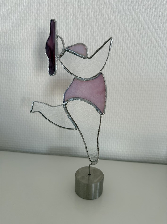 Der kan tilkøbes en lille metalfod så damen kan stå inde til pynt. (Pris 35,-)